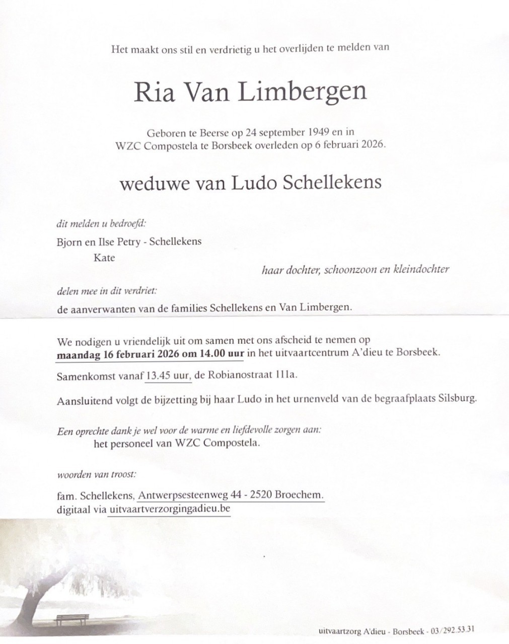 Met grote droefheid vernamen wij het overlijden van Ria Van Limbergen, lieve mama van Ilse Schellekens, schoonmama van Bjorn en fiere oma van Kate. Wij wensen de familie veel sterkte in deze moeilijke tijd.